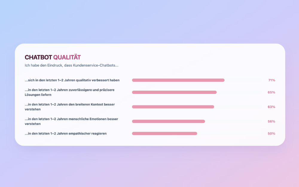 Viele Diskussionen hängen noch am Bild des alten Chatbots: stumpf, unflexibel, ohne Kontext. Das Problem ist: Dieses Bild ist historisch aber nicht komplett verschwunden. Gleichzeitig zeigt sich: Verbraucher nehmen sehr wohl wahr, dass Chatbots in den letzten ein bis zwei Jahren deutlich besser geworden sind - in Qualität, Zuverlässigkeit und Kontextverständnis. Und trotzdem, mehr als 70 % bevorzugen weiterhin ein menschliches Gegenüber, weil Menschen in Empathie und kreativer Problemlösung überlegen sind.